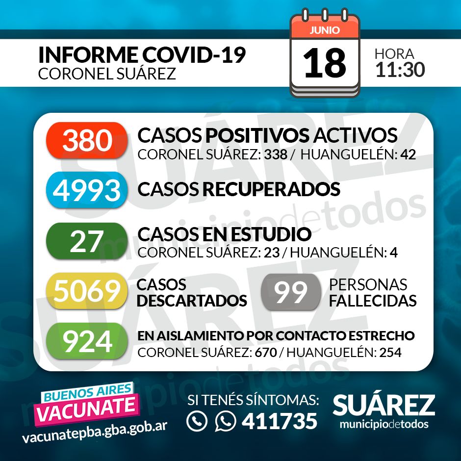 18/06/2021 SITUACIÓN DE COVID-19 EN CORONEL SUÁREZ Parte: 427 - HORA 11:30