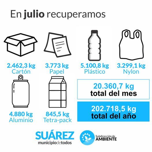 La subdirección de Ambiente informa que durante el mes de JULIO se vendieron 20.360,7 kg. de material recuperado en la Planta de Separación y Tratamiento de Coronel Suárez, llevando en lo que va del año 202.718,5kg.
