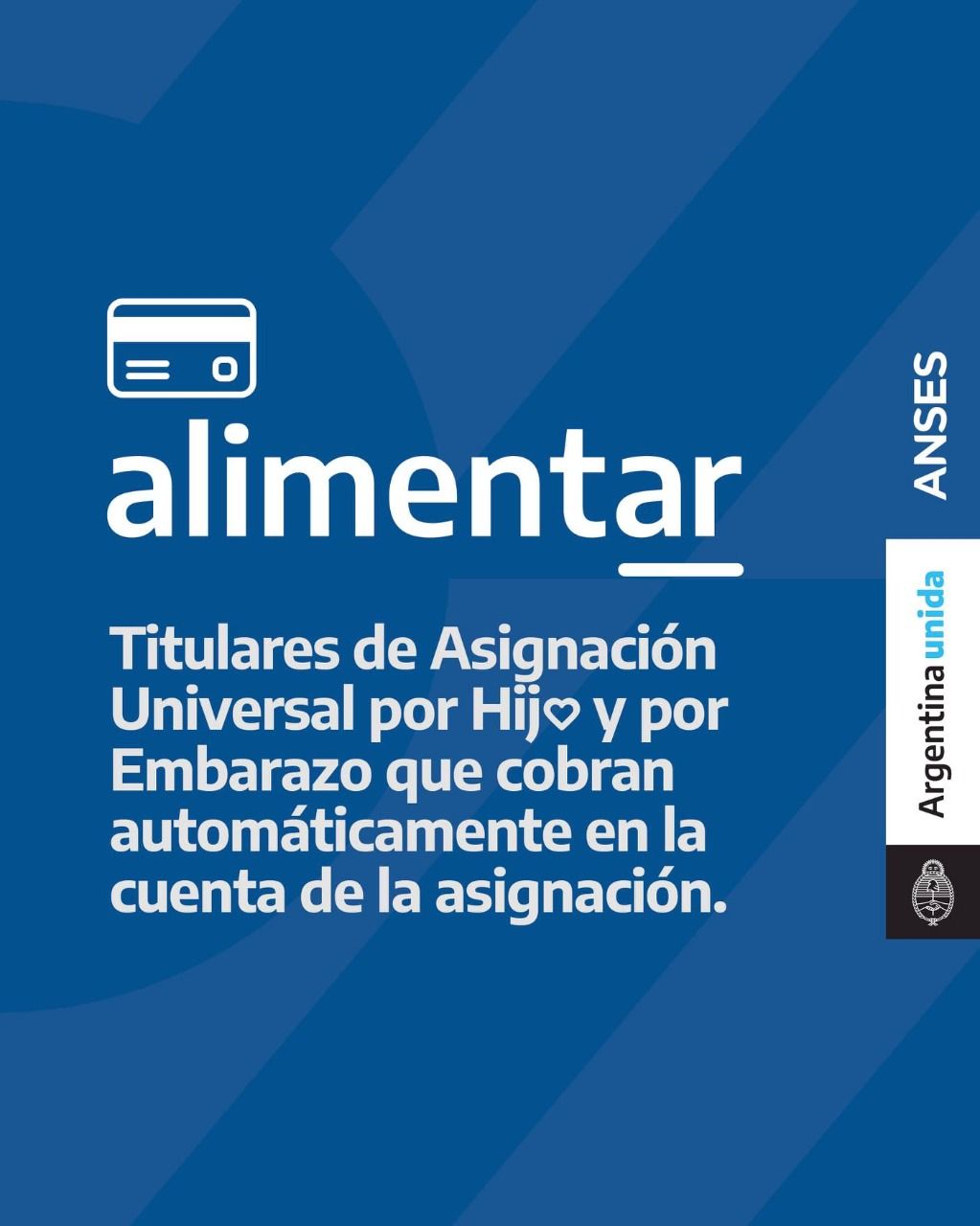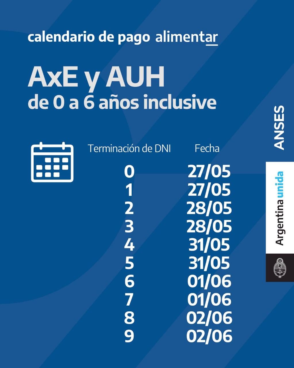 Anses abonará la Tarjeta Alimentar a beneficiaros de la AUH de 0 a 6 años y de 7 a 14 inclusive, que no tengan la tarjeta plástica según el siguiente calendario de pago. Se les acreditará en la misma cuenta que perciben la asignación.