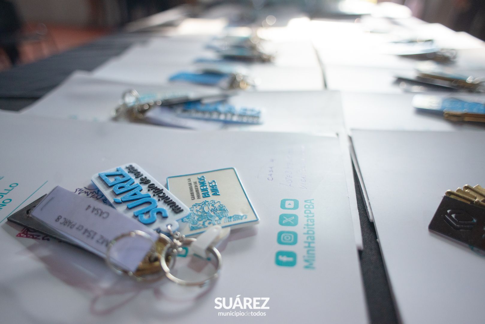 El acto, donde 27 familias recibieron las llaves ‘en mano’ de su primer hogar, se realizó en el polideportivo municipal de Coronel Suárez y contó con la participación del administrador general del Instituto de la Vivienda, Diego Menéndez y el subadministrador, Hernán Ralinqueo.