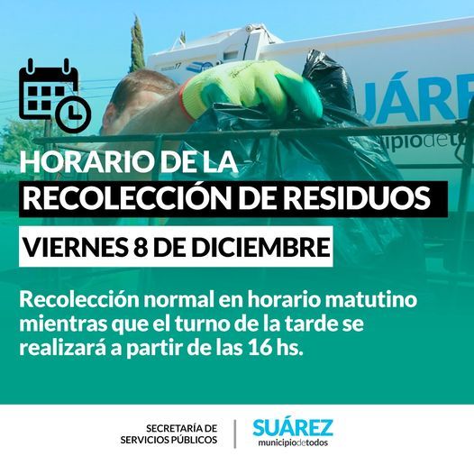 La secretaría de Servicios Públicos informa a la población que mañana viernes 8 de diciembre feriado por el Día de la Inmaculada Concepción de María, la recolección de residuos será normal en horario matutino, mientras que por la tarde se realizará a partir de las 16.