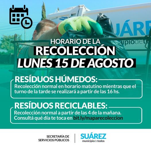 La secretaría de Servicios Públicos informa a la población que este lunes 15 de agosto -Feriado Nacional por el aniversario del Paso a la Inmortalidad del General San Martín- la recolección de residuos será normal en horario matutino, mientras que por la tarde se realizará a partir de las 16.