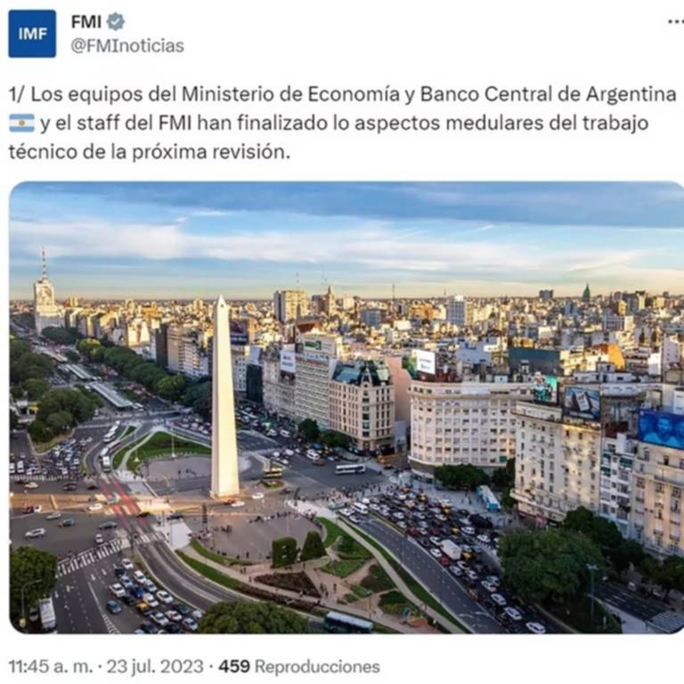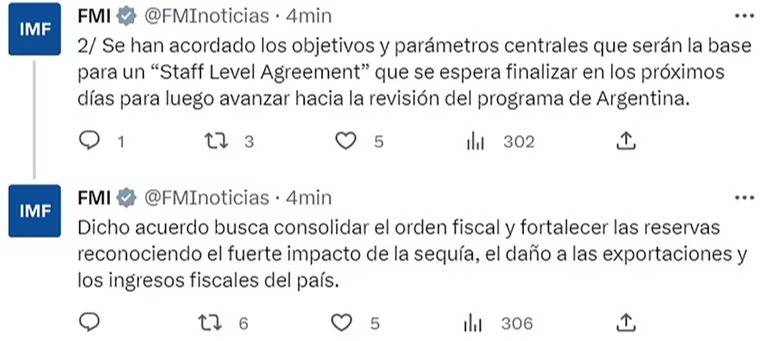 En un posteo en Twitter, el FMI señaló que "se han acordado los objetivos y parámetros centrales para un Staff Level Agreement que se espera finalizar en la semana entrante para luego avanzar en la revisión del programa de Argentina".