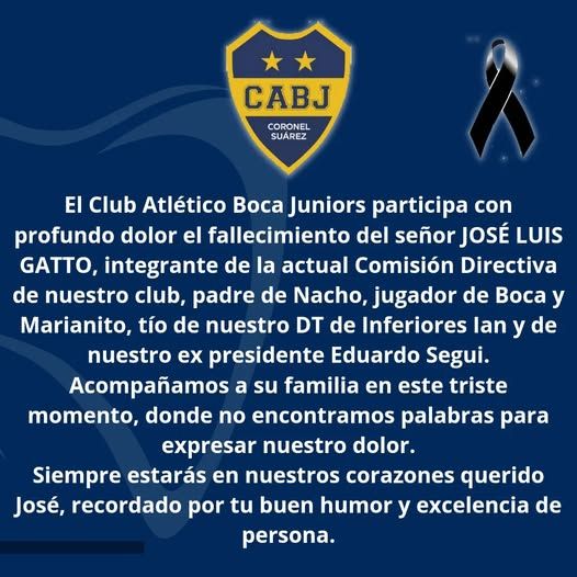 EL CLUB ATLÉTICO BOCA JUNIORS DECRETA DUELO INSTITUCIONAL DE 24 HS EN MEMORIA DE NUESTRO DIRECTIVO JOSÉ LUIS GATTO