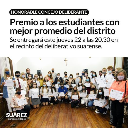 El Honorable Concejo Deliberante de Coronel Suárez invita a la comunidad a participar de la Sesión Especial que se realizará este jueves 22 de diciembre, a las 20:30, en la sala de sesiones para hacer entrega del Premio Honorable Concejo Deliberante del partido de Coronel Suárez, a los dos egresados con mayor promedio del Nivel Secundario, (incluidos CENS y Plan FinEs), Trayectoria Educativa y Nivel Terciario de los Establecimientos Educativos del Distrito.