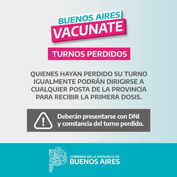 Además, todo aquel que haya perdido el turno de la primera dosis puede concurrir con la constancia de que lo tenía asignado y será vacunado.