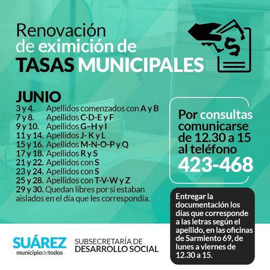 La subsecretaría de Desarrollo Social informa a todos los vecinos y vecinas que necesiten tramitar la renovación de la Eximición de Tasas Municipales, deberán entregar la documentación los días que corresponde a las letras según el apellido, con el propósito de respetar el protocolo Covid-19, el distanciamiento social y el uso obligatorio de tapaboca, en las oficinas de Sarmiento 69, de lunes a viernes de 12.30 a 15.⠀