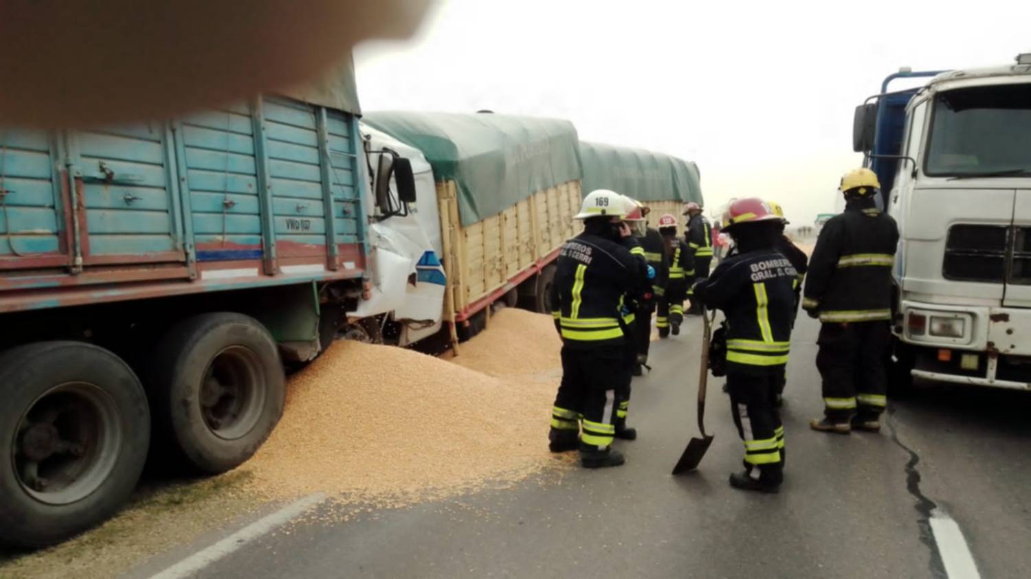 Como consecuencia de la colisión se produjo el derrame de cereal, por lo que trabajaron en el lugar bomberos del cuartel de General Daniel Cerri para limpiar la cinta asfáltica y liberar el tránsito por la zona.