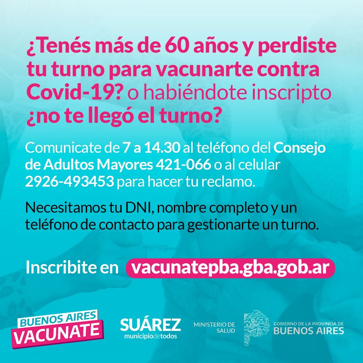 ¿Tenés más de 60 años y perdiste tu turno para vacunarte contra Covid-19? o habiéndote inscripto no te llegó el turno?⠀
