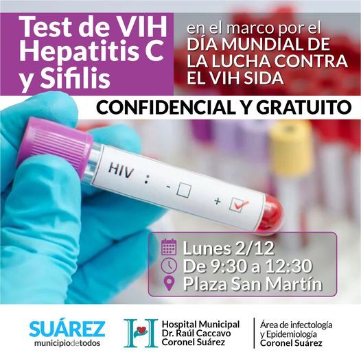 El test es la única manera de saber si tenés el virus. En la Provincia de Buenos Aires 3 de cada 10 personas que viven con VIH no lo saben. La jornada se realizará el lunes 2 de diciembre, en la plaza San Martin de 9.30 a 12.30. Se realizarán testeos de VIH (SIDA), VDRL(sífilis) y VHC (hepatitis virales)