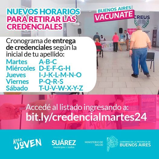 Vacunate Suárez: Ampliamos el horario de la entrega de credenciales de personas que registran vacunación Covid-19