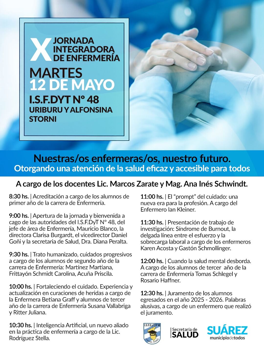 • 9:00hs. Apertura de la jornada y bienvenida a cago de las autoridades del I.S.F.DyT Nº 48, del jefe de área de Enfermería, Mauricio Blanco, la directora Clarisa Burgardt, el vicedirector Daniel Goñi y la secretaria de Salud, Dra. Diana Peralta.